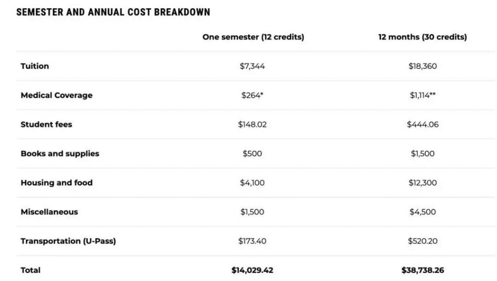 并且费用也相对于大学要便宜很多。与Langara College类似,国际学生每个学分收费为$612.