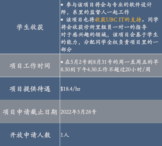 该项目是UBC专门为了在读学生设计的,旨在提供能够帮助学生增加一些校内工作经验,加强对于学术以及未来职业规划的理解。
