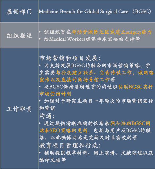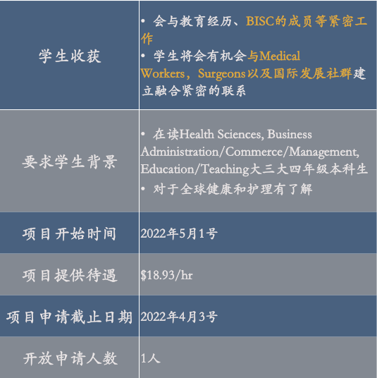 该项目主要是为商科专业以及和健康医疗相关的学生提供的。学生在该项目要接触到BGSC业务的相关人士,了解团队合作的重要性,针对分析市场,共同制定市场战略计划。通过各种手段和媒体达到拓展市场的目的。该项目将让参与的学生很好的将书本中marketing的内容与现实相结合。由于此项目与人文社会息息相关,对于自己的个人经历也是一个很好的背书。
